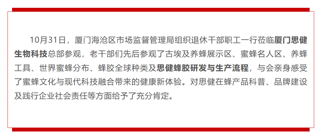 思健科技動(dòng)態(tài) | 海滄市場(chǎng)監(jiān)督管理局退休干部職工參觀思健蜂主題科技館及蜂膠生產(chǎn)車(chē)間